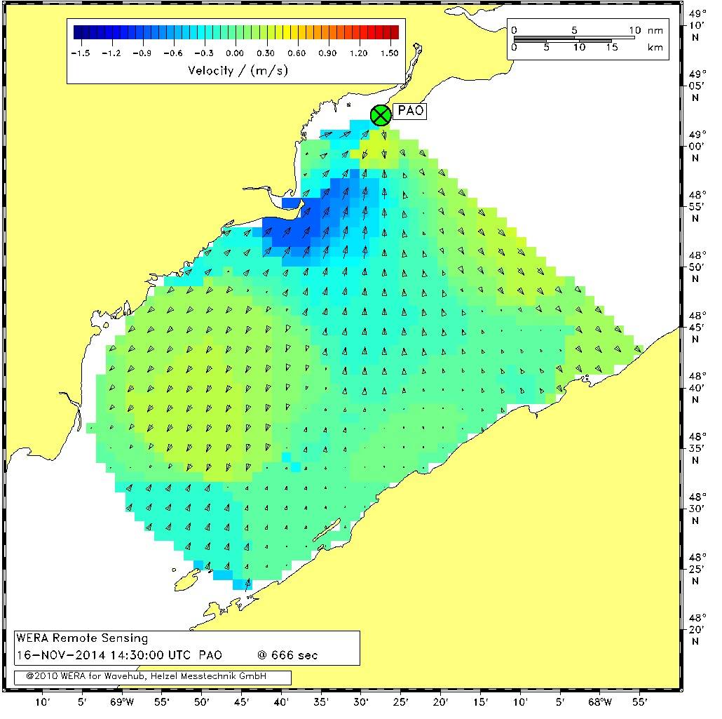 The shore-based WERA NorthernRadar provides data for ocean surface currents and significant wave height and direction over long distances (up to 200 km) with spatial and temporal resolution.