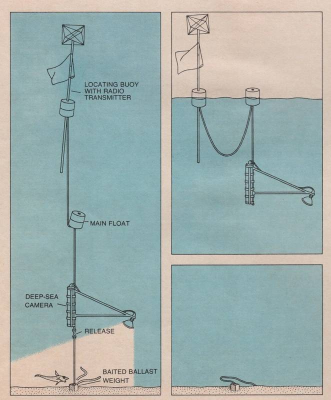 Scripps Institution’s John D. Isaacs’ baited camera free falls into the deep sea to reveal unknown fish species and other scavengers that are attracted to bait attached to the anchor in 1968. Isaacs’ work showed that still images identified sea life, while film clips revealed behaviors. At a pedefined time, the anchor is released and the camera system floats back to the surface where it is recovered. Image courtesy of Scripps Institution of Oceanography/UCSD