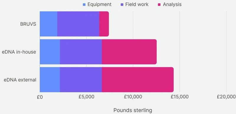 The eDNA costs covered the Kemmerer sampler, the at-sea filtration system, the boat hire, and the eDNA kits, and the analysis by NatureMetrics. Again, the first year is more expensive than subsequent years as purchased equipment will be reused year-to-year. The cost of carrying out the analysis in-house versus outsourcing the analysis was considered. Given a different level of expertise is required for BRUV video analysis than in-house eDNA analysis, the labor costs of each method were accounted for. The time taken to carry out the fieldwork was accounted for.
