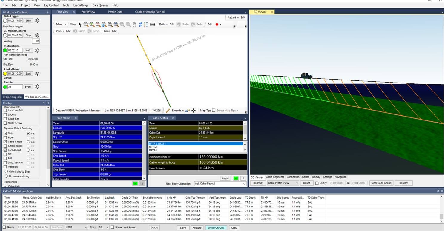 The system includes two fully integrated components: the Vessel Simulator, which generates live ship positioning, plough parameters, and cable engine data in real-time; and the Training Simulator, a desktop version of MakaiLay that interacts with the vessel data just as it would during an actual at-sea operation. Together, they enable immersive training sessions for both individual operators and teams.