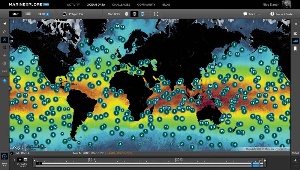 Marinexplore is a Silicon Valley-based company founded in 2012, creating a big data platform for ocean data. The company has already aggregated and organized over 1.5 billion measurements from more than 31,000 ocean-borne platforms and 12 satellites products. The open data focused Marinexplore community has grown close to 5,000 people involving ocean professionals from across the globe.