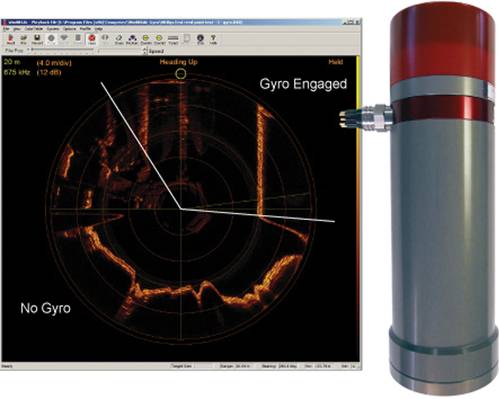 The Imagenex Model 881L-GS sonar, which employs a low drift gyroscope as well as a magnetic compass, is designed to be capable of correcting for orientation changes at a rate in excess of 500 degrees per second, which allows it to compensate for sudden turns and inadvertent bumping or jarring. Therefore, scan lines are displayed without blurring, compression or smearing effects in all modes of operation, be it polar, sector or North-up. The North-up mode references the sonar image to true north when using an appropriate variation input. Regardless of platform heading changes, the sonar is able to keep the target continuously at the center of the scanning sector. Positional changes of aspect relative to the target are easily compensated by clicking the “Set Gyro Reference” button on the screen.
