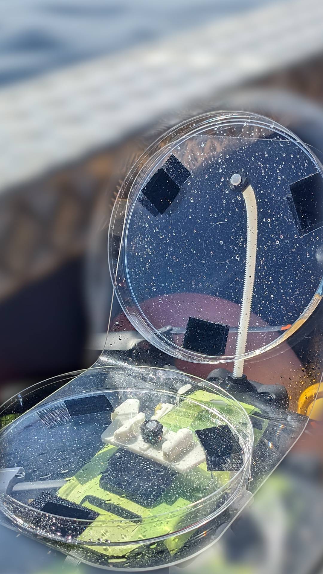 Dish with droplets of blow mounted on a small drone. (Photo by Amy Warren, NEAq/WHOI, NMFS/NOAA Permit #21371)