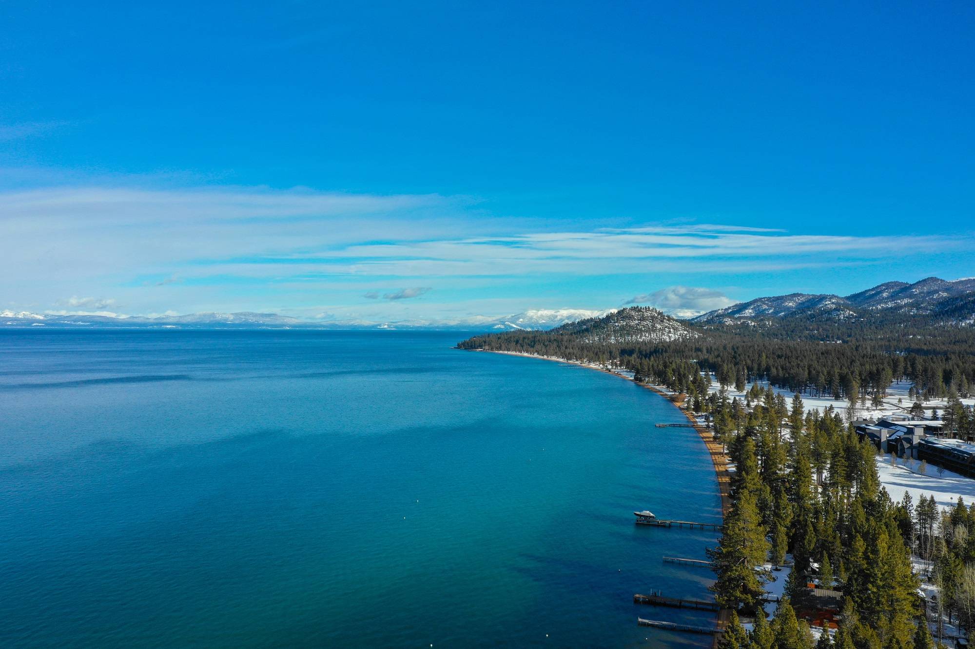 Lake Tahoe is a large freshwater lake in the Sierra Nevada Mountains, straddling the border of California and Nevada.