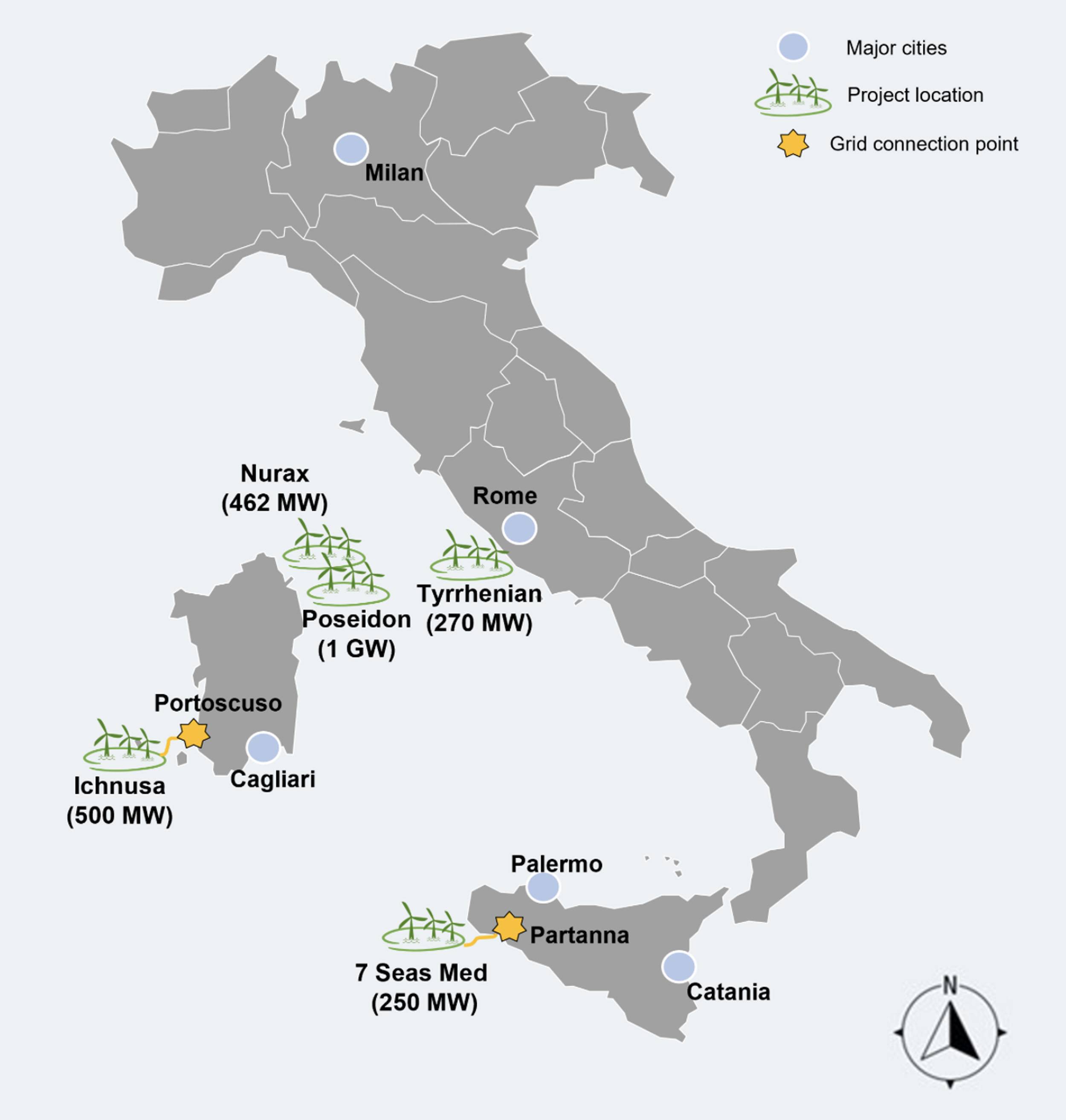 The areas for the three projects lie off the northeast coast of Sardegna and off the coast of Lazio, Italy. Combined, the three projects are expected to produce around 5 TWh/y of power, with commercial operation expected between 2029 and 2031, after completion of the authorization process and construction.